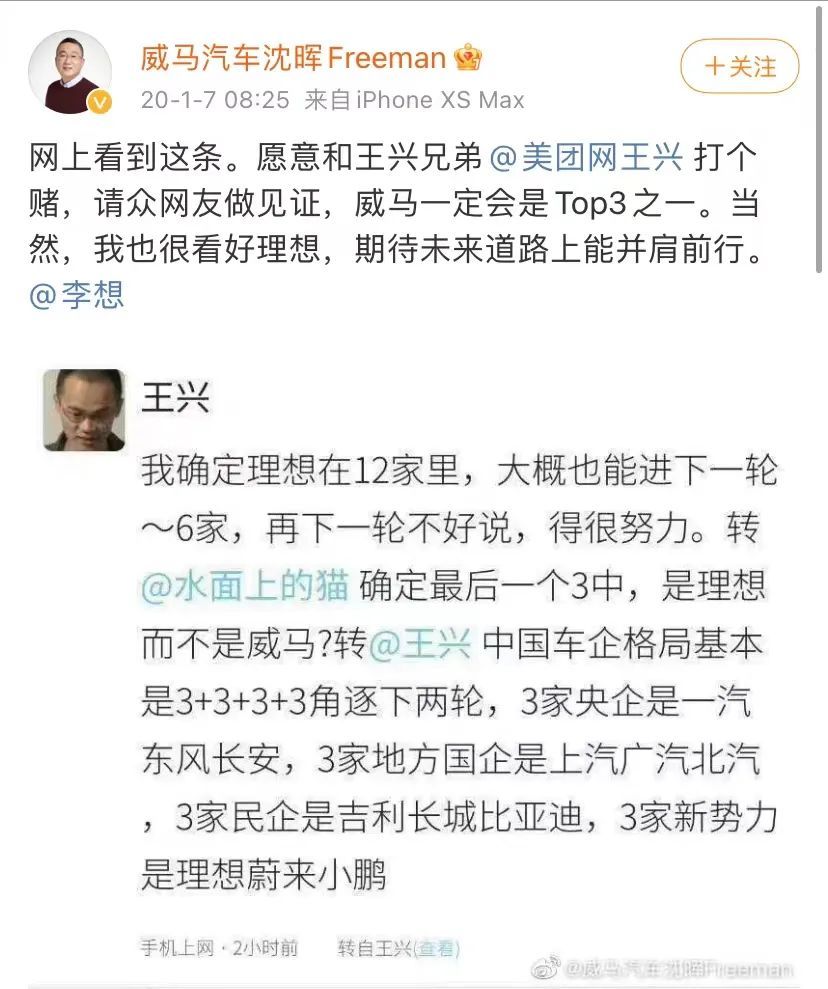 2020年1月,威马创始人沈晖在微博上转发了王兴的一段话,称要与王兴来一场对赌,未来威马汽车一定会是新势力里的Top 3。