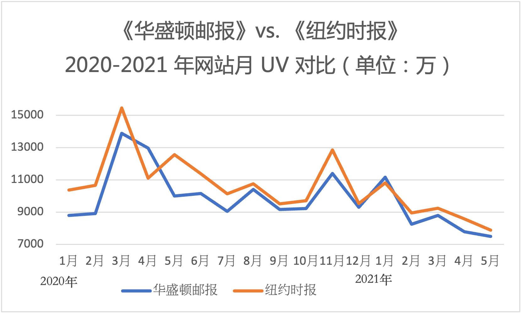 2016年的美国总统大选、2020年的新冠疫情和总统大选等大型公共事件让《华盛顿邮报》网页和数字端浏览量、付费订阅用户量再度实现了突破式增长。月均UV以20%至30%的年同比增长幅度,从2015年6000万一路飙升到2020年近1亿4千万的历史高点,网站和APP的付费订阅会员从2016年的30万人一路攀升至2020年的300万人。