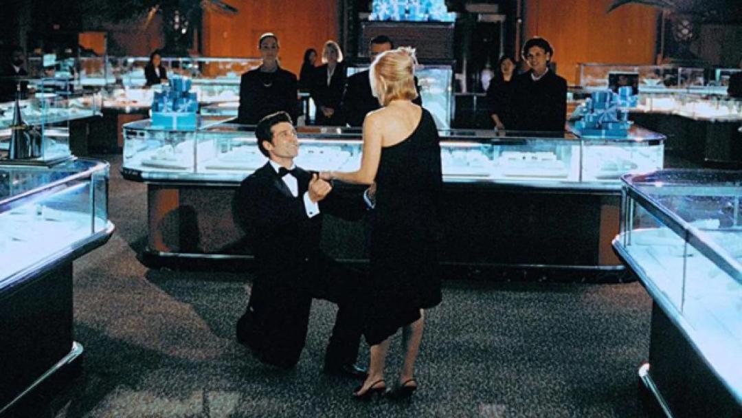 结婚必须买钻戒这件事,是整个产业链长期市场教育的结果。上游有戴比尔斯的“钻石恒久远,一颗永流传”,下游的蒂芙尼在电影里疯狂植入,《情归阿拉巴马》中,帅气多金的市长公子包场蒂芙尼销售大厅,向女主角求婚:pick one。