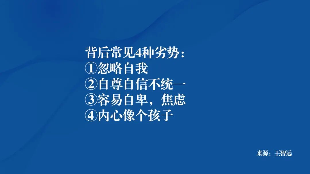从向外探索角度出发,这4个劣势更利于看清自我欠缺一面:①忽略自我,委屈求全,②自尊自信不在统一水平线,③容易自卑,焦虑,④内心像个孩子