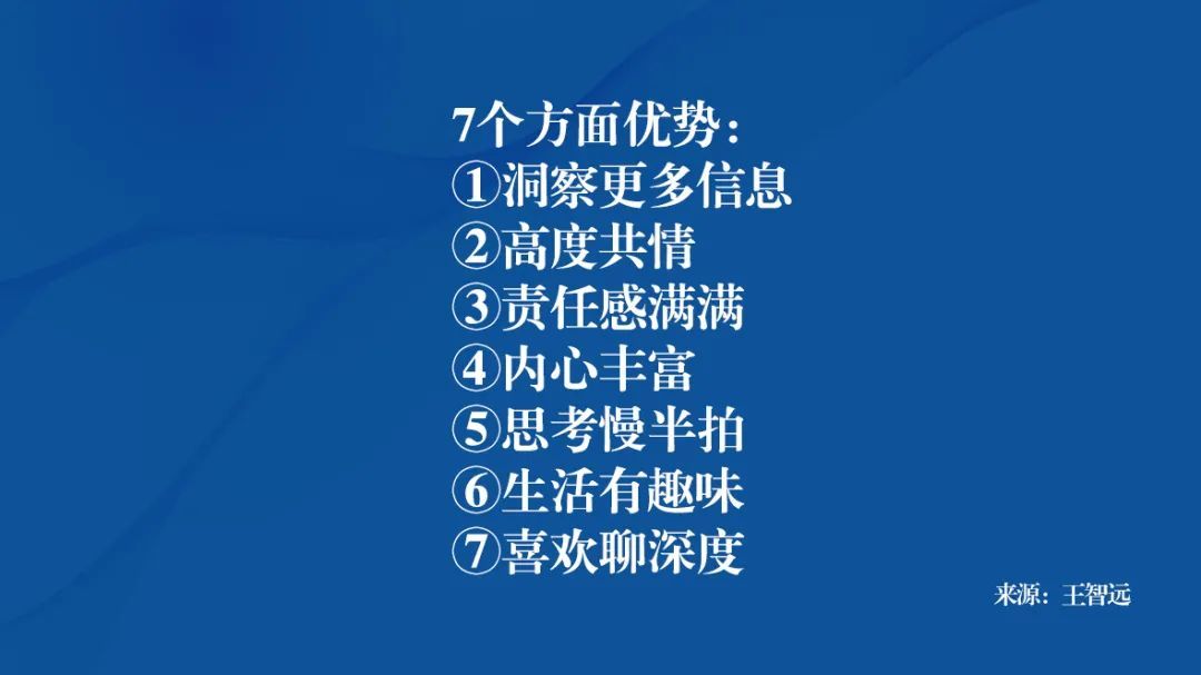 ①洞察更多信息,②高度共情,③责任感满满,④内心丰富,⑤思考慢半拍,⑥生活有趣味,⑦喜欢聊深度