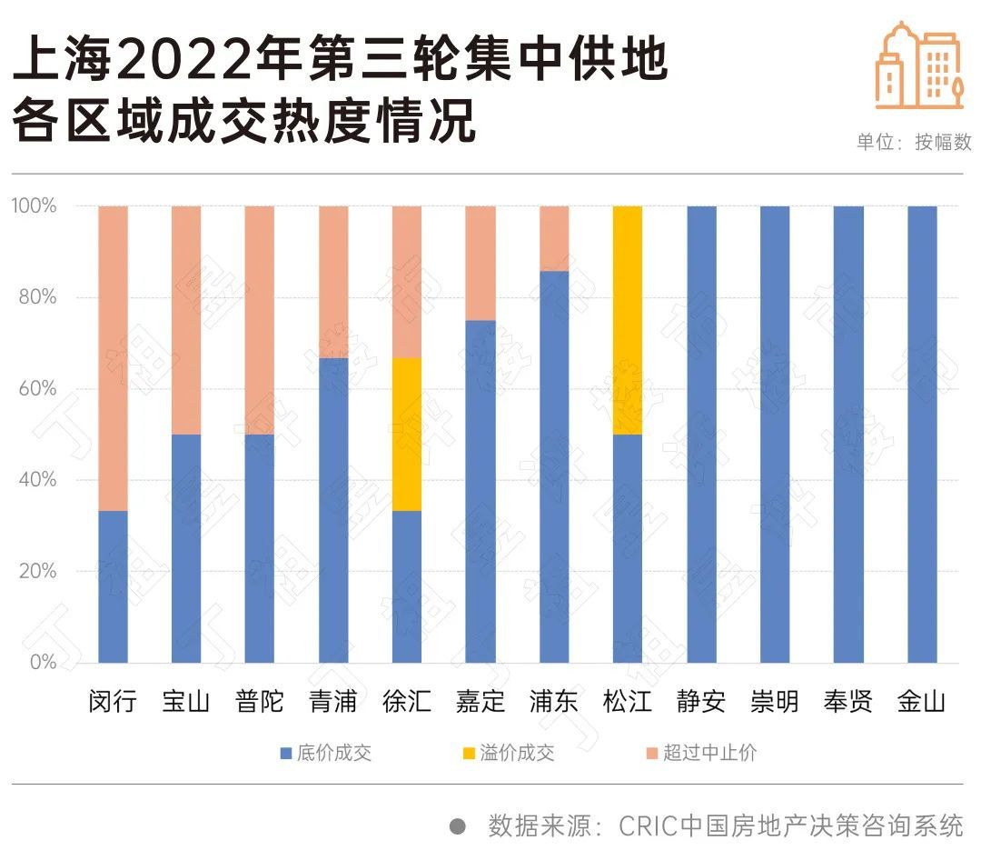 例如,闵行本次共出让3宗地,其中2宗地块位于热度较高的华漕和古美,均触及中止价,仅有位于颛桥的城中村地块底价成交;徐汇区出让的3宗地块中,龙华街道地块也超过中止价,华泾的纯宅地溢价率达到6.3%,综合地块则由于可售住宅比例太低而底价成交。