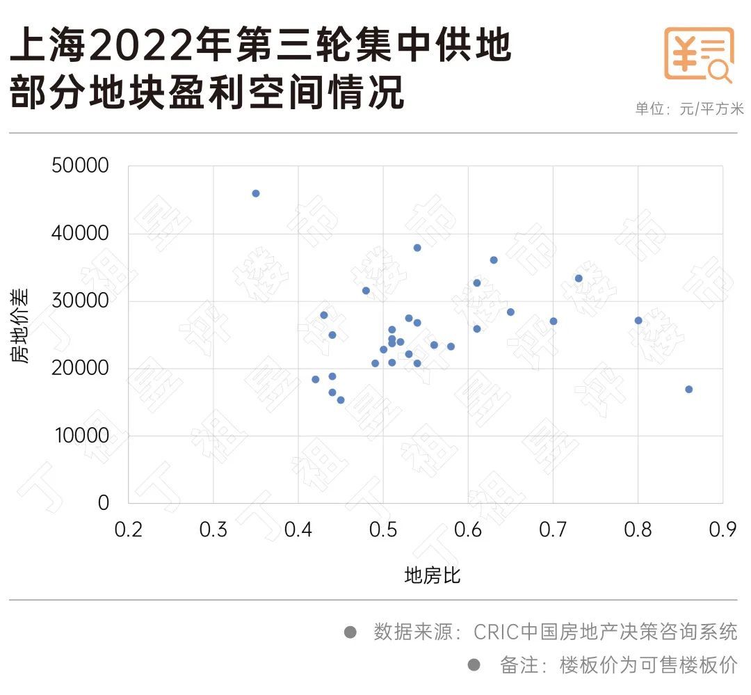 通过可售楼板价与销售指导价的对比来看,本次上海土拍的平均地价房价比为0.55,平均房价地价差为25495元/平方米,盈利空间较为充裕。其中5宗地的房价地价差达到3万元/平方米以上,包括超过中止价成交的桃浦科技城地块、徐汇龙华地块和唐镇中心镇地块。