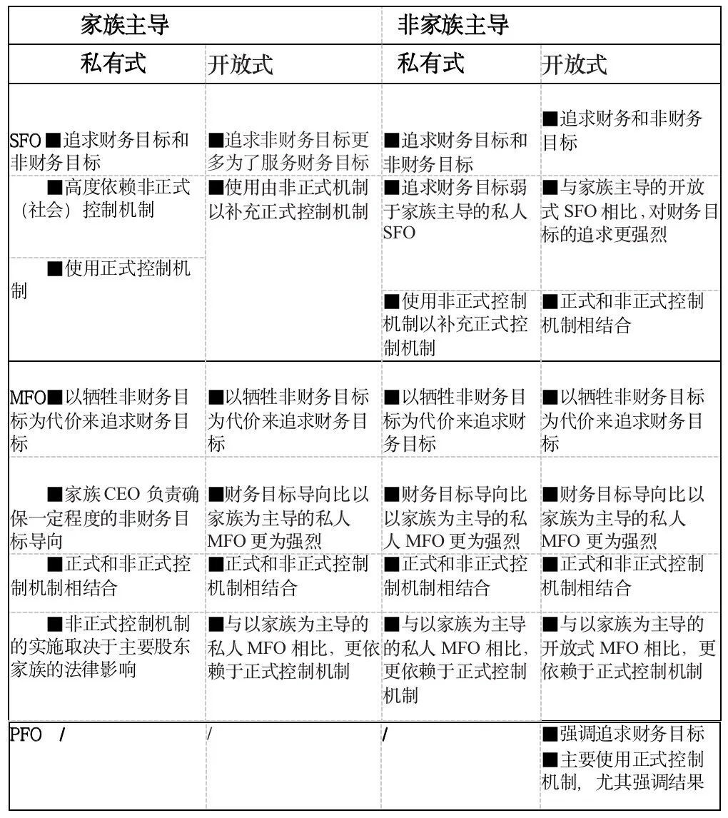 在家族占主导地位的私人SFO中,家族和家族CEO在投资配置、风险-回报均衡和非财务目标方面的追求是完全一致的。因此,这种类型的FO没有代理风险,同时追求财务和非财务目标。