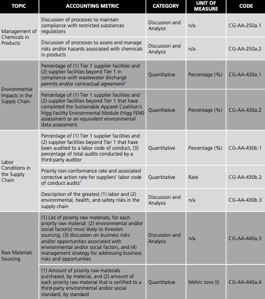 lululemon属于Consumer Goods(消费品)下细分的Apparel, Accessories & Footwear(服装、配件和鞋类)。与lululemon相关的实质性议题,根据SASB的指引,包含Management of Chemicals in Products(产品质量管理), Environmental Impacts in the Supply Chain(供应链对环境的影响),Labor Conditions in the Supply Chain(供应链中的劳工情况) 和Raw Materials Sourcing(原材料管理)。