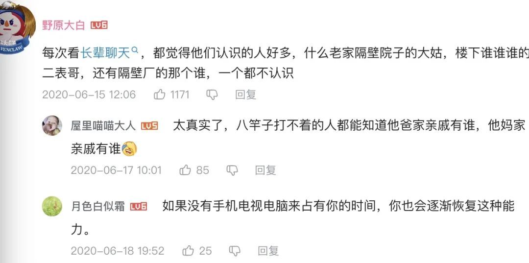 有人跪求5小时纯享音频版,有人羡慕长辈们搭建社交网络的超能力,对八杆子打不着的人和事也能娓娓道来。