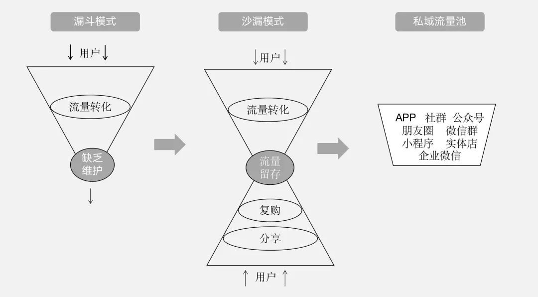 沙漏模式是一个完整的良性的闭环。从用户的吸引、用户转化、用户留存、用户复购再到分享裂变,是一个完整的客户关系管理的过程。只有这样,企业才能有沉淀客户,让客户产生复购,最终形成品牌。