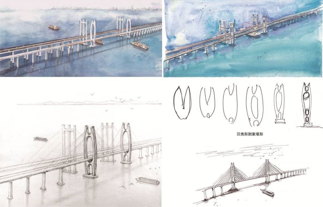 (图源:铁四院严爱国团队)▲ 泉州湾跨海大桥手绘图及方案构思演变