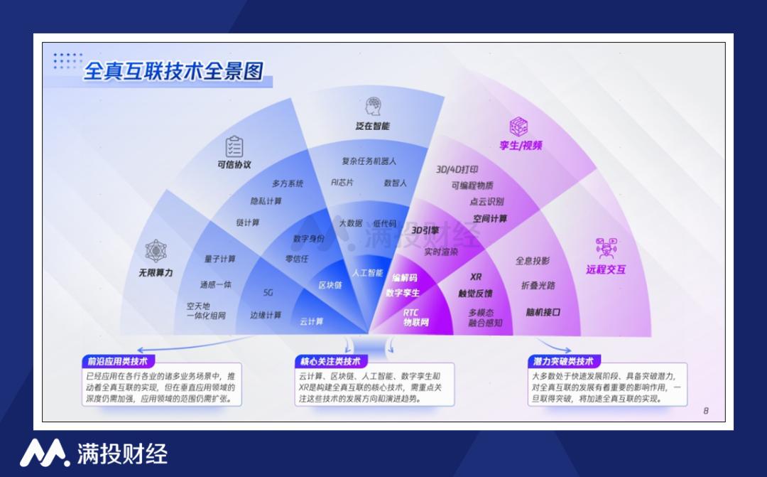 根据腾讯的设想,全真互联的落地需要五大技术体系不断演进。其中,孪生/视频、远程交互是核心,泛在智能、可信协议、无限算力则是支撑。预计到2040年,量子计算、全息投影、折叠光路、脑机接口等前沿技术有望迎来进一步突破,支撑全真互联全面应用。