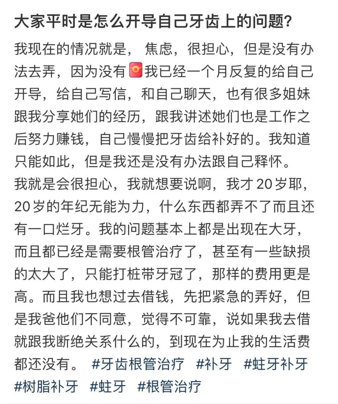 她在社交平台疯狂搜索治牙相关的信息,想安慰自己“等工作赚钱了再去治也不迟”。但看到别人分享的治疗方案、医生和费用,看到所有人都在说“牙齿疾病要尽快治疗,越拖越严重、越拖越费钱”,她更加焦虑了。