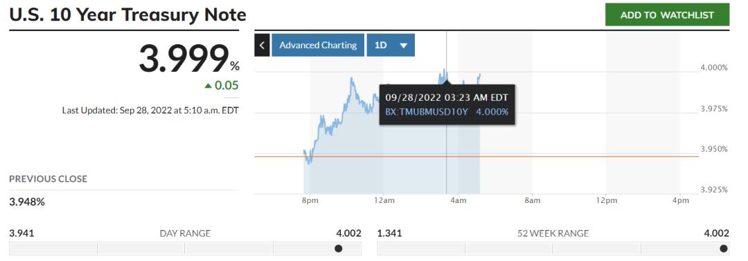 9月27日周二,10年期美国国债收益率飙升至3.988%,是年初水平的两倍多。而美东时间9月28日凌晨,收益率一度达到4%。自2010年4月5日以来,10年期美国国债收益率还没有突破4%的水平。根据Tradeweb的数据,上一次在纽约市场该收益率突破4%的水平收盘还是在2008年10月15日。