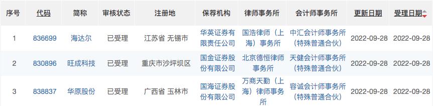 9月28日,北交所受理了三家报送上市申报材料的公司,它们分别是旺成科技(830896)、华原股份(838837)、海达尔(836699)。