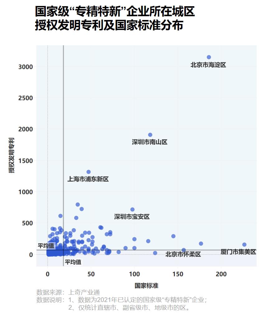 根据上奇产业通数据,拥有国家级“专精特新”企业的城区,平均参与制定国家标准18项、拥有授权发明专利66件。其中北京海淀区创新优势明显,拥有授权发明专利3,144件,参与制定国家标准186项。