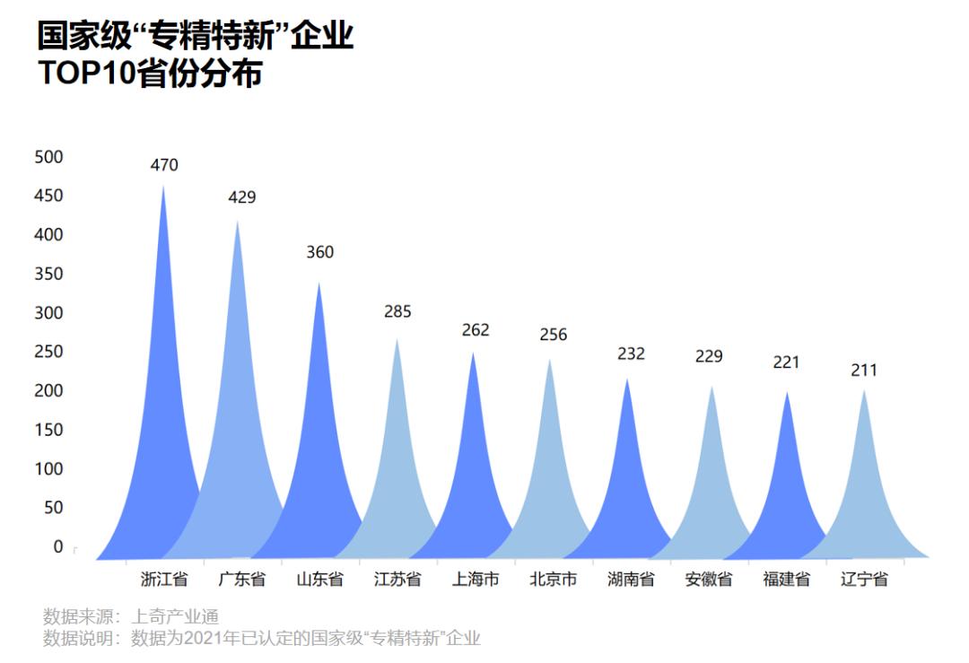 根据上奇产业通数据,从省份分布来看,国家级“专精特新”企业主要集中在浙江、广东、山东等省份。