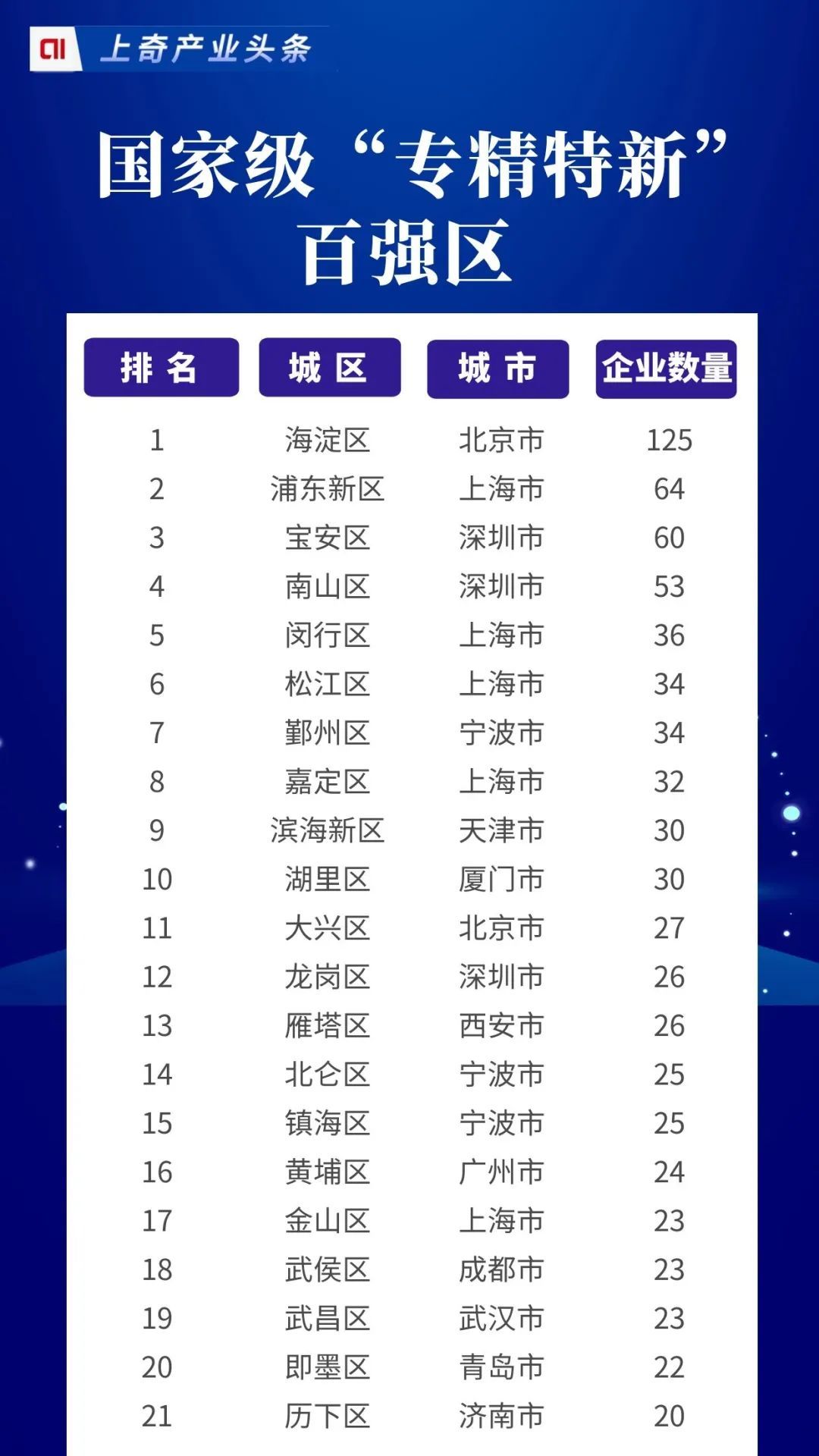 国家级“专精特新”百强区榜单:海淀领跑,浦东宝安位列二三