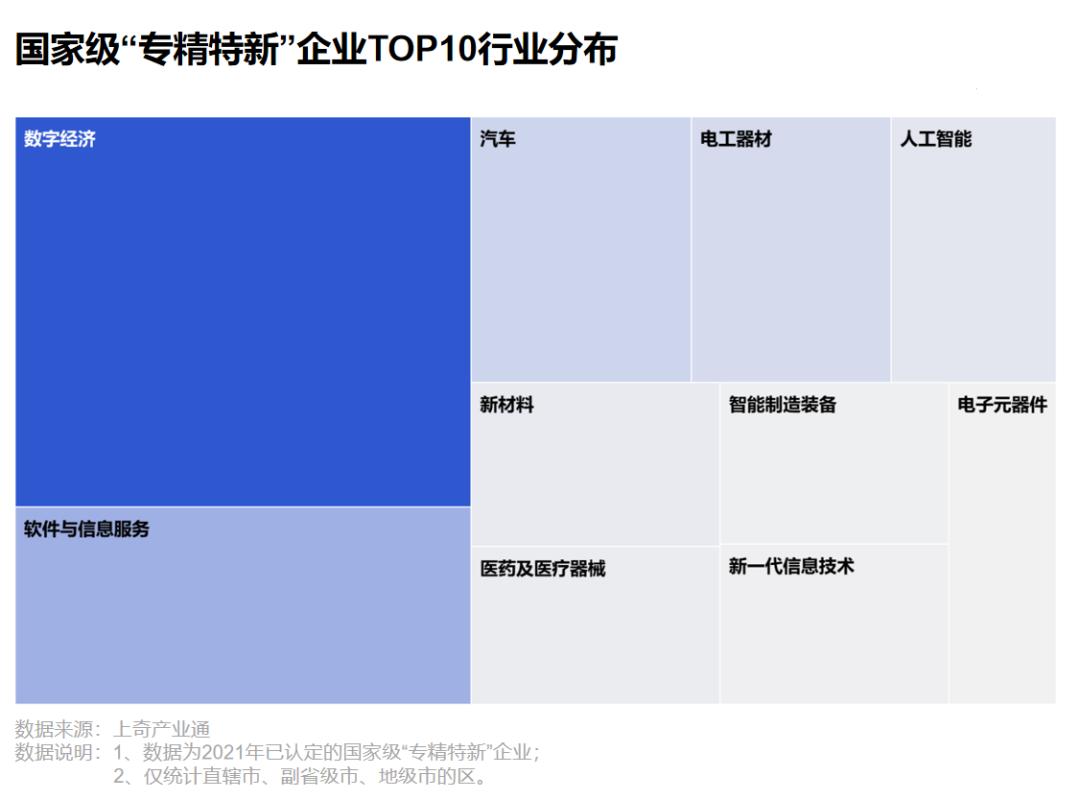 根据上奇产业通数据,国家级“专精特新”企业主要集中在数字经济、软件与信息服务、汽车等行业。