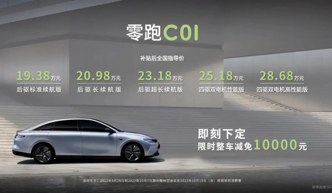 为了刺激人们买单,9月28日晚上,零跑还特意搞了一个限时售价,每款车型都比官方指导价优惠1万元。