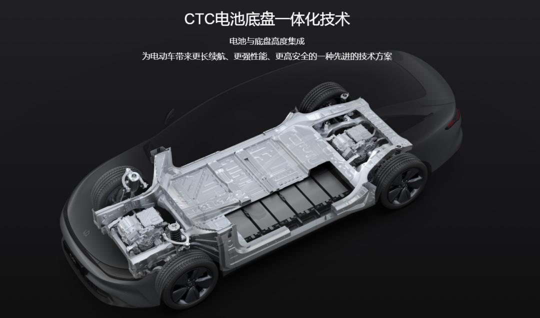 这款车型最大的亮点,是国内首款采用了CTC(Cell To Chassis)技术的车型。CTC技术就是将电池组与底盘进行集成设计,能有效减少20%的零部件数量,而且还能提升空间利用率和系统比能的同时,让车身与电池结构互补,使电池抗冲击能力及车身扭转刚度得到大幅度提升。