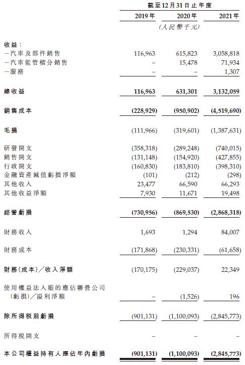 2019年-2021年,零跑营收分别为1.17亿元、6.31亿元和31.32亿元,同比增速在400%左右;但同期亏损也在持续扩大,2019-2021年,零跑净亏损分别为9.01亿元、11亿元、28.46亿元,累计亏损超48亿元。