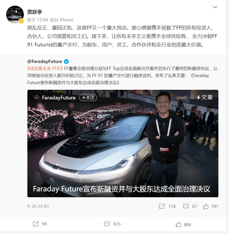 不过,在经历了请愿、提议,再到诉诸法院等数轮多方博弈之后,贾会计最终笑到了最后。法拉第未来在9月26号宣布,就治理分歧与FF Top达成全面解决方案并且执行了最终的新融资协议。