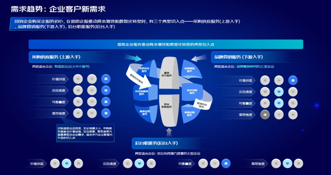 与营销及后台职能服务相比,采购供应服务的落地难度更低,见效速度更快,价值创造也更高。因此,越来越多的企服供应商选择从采购切入,延伸企业服务半径,通过强化全价值链解决方案和广泛下游行业覆盖,帮助企业降本增效。