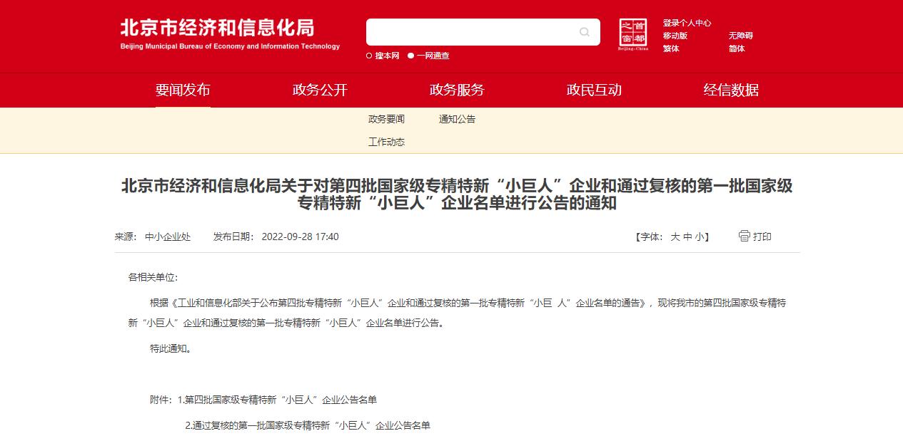 9月28日,北京市经济和信息化局《关于对第四批国家级专精特新“小巨人”企业和通过复核的第一批国家级专精特新“小巨人”企业名单进行公告的通知》,显示北京汉王影研科技有限公司、北京卫蓝新能源科技有限公司、北京忆芯科技有限公司、中关村科学城城市大脑股份有限公司等333家北京企业获评第四批国家级专精特新小巨人,4家企业通过第一批国家级小巨人复核。