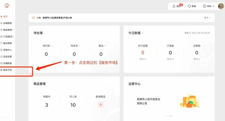 本次新功能不再根植于视频号后台界面,而是加入到了视频号小店后台的界面,商家进入小店后台,选择“服务市场”,即可选择你所需要的服务。