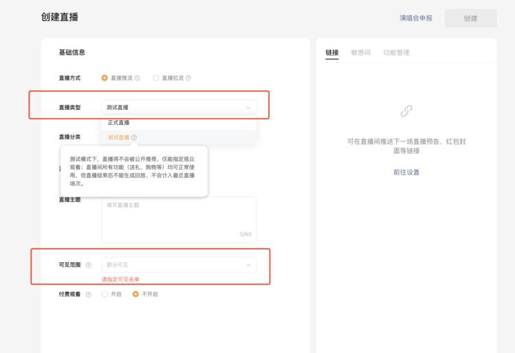 测试直播不会被公开推荐,预约开播提醒、关注开播提醒等不会下发,仅能通过主播个人主页及分享访问( 非白名单用户,在个人主页见不到直播卡片,也无法通过分享进入测试直播间)。