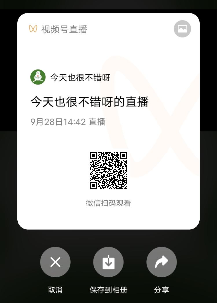 视频号发起直播后,主播点击右上角 […] ,选择 [直播二维码] 即可生成专属推广码,点击右上角图标可更换背景图,支持图片下载和直接分享给朋友。
