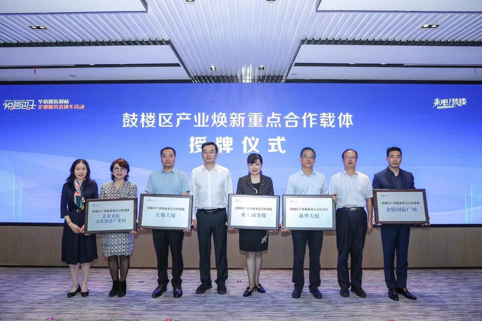 会上还举办了鼓楼区产业焕新重点合作载体授牌仪式,鼓楼区华侨路街道工委书记疏新生、规划资源局鼓楼分局局长涂志华、鼓楼区工商联党组书记、副部长岑继白为亚太商务楼、新华大厦、大地大厦、金轮地产、艺术金陵等新街口西北象限重点载体授牌。
