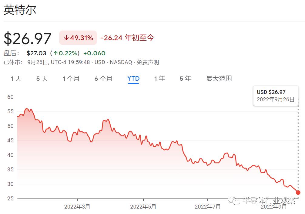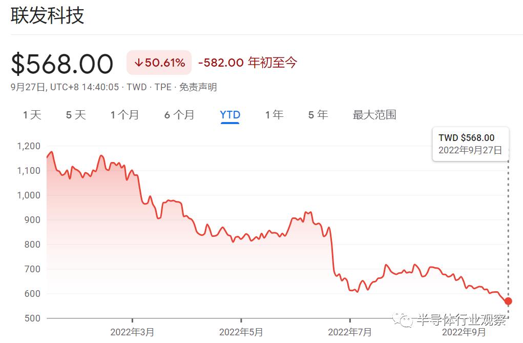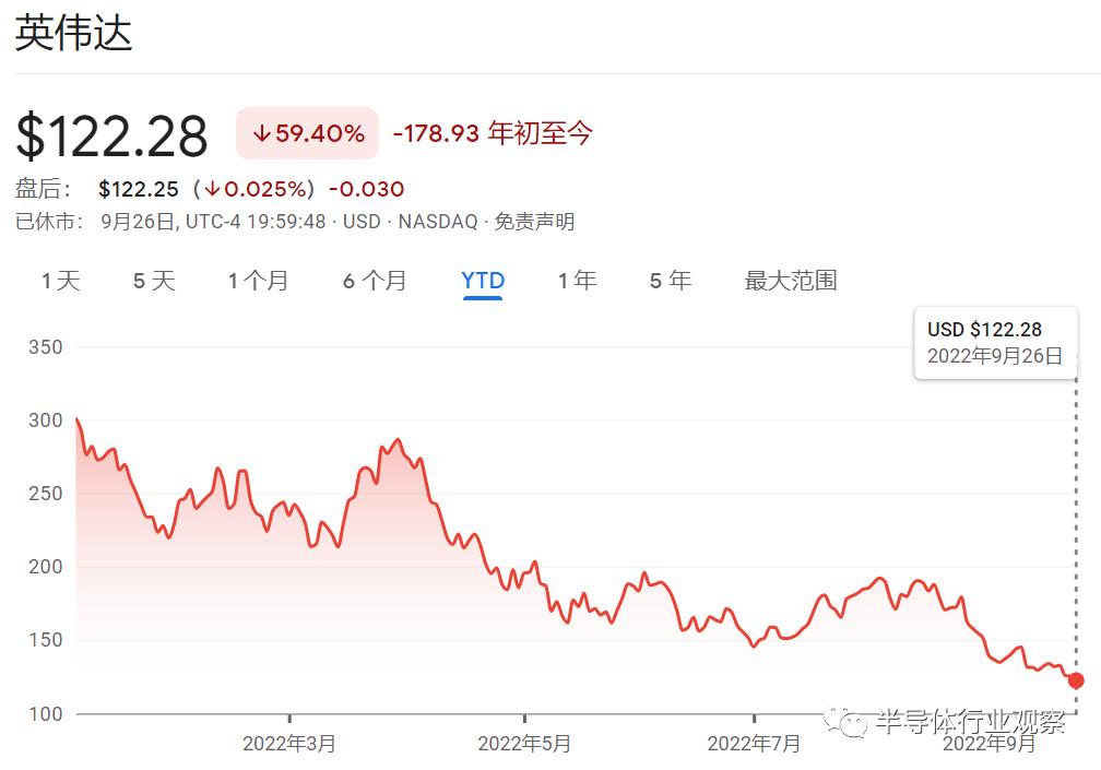 反映到资本市场上,由于市场需求放缓和芯片制造商的库存增加,整个半导体行业将出现低迷,于是投资者开始纷纷抛售半导体巨头的股票,英伟达、英特尔、台积电、联发科等半导体芯片巨头股价开始大幅下跌,进入技术性熊市。