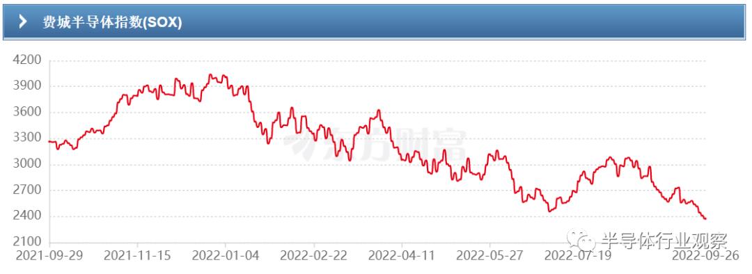 另一边,作为全球半导体行业的风向标,费城半导体指数象征着全球半导体产业的走势与兴衰。回望费城半导体指数近期走势,也是跌幅巨大,从今年年初的4000多点跌到如今的2373点左右,跌幅接近腰斩。