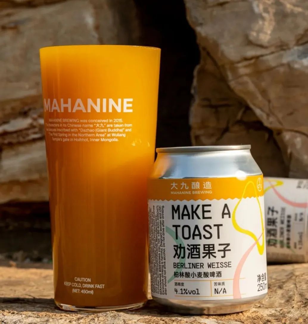 2022年8月23日,来自内蒙古的精酿啤酒厂牌“大九酿造”推出新品:劝酒果子柏林酸小麦酸啤酒,该新品选取PH值3.2的柏林酸小麦啤酒搭配劝酒果子,经过kettle Sour工艺进行加工,酒精度为4.1%,口感酸甜细腻。