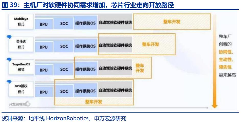 但单纯的芯片算力并不能完全代表自动驾驶能力,也要考虑对算力调用的效率。因此申万宏源认为,以专业化架构+软硬结合的方式实现芯片的高实用性能或成为未来芯片厂商的主流方案。同时未来的自动驾驶也需要更加开放,一家公司不可能独揽功能与算法的定义,行业需要更加合作,才能促使自动驾驶的落地。芯片行业产业链有望由垂直式链条走向“朋友圈”式更开放、更灵活的路径。