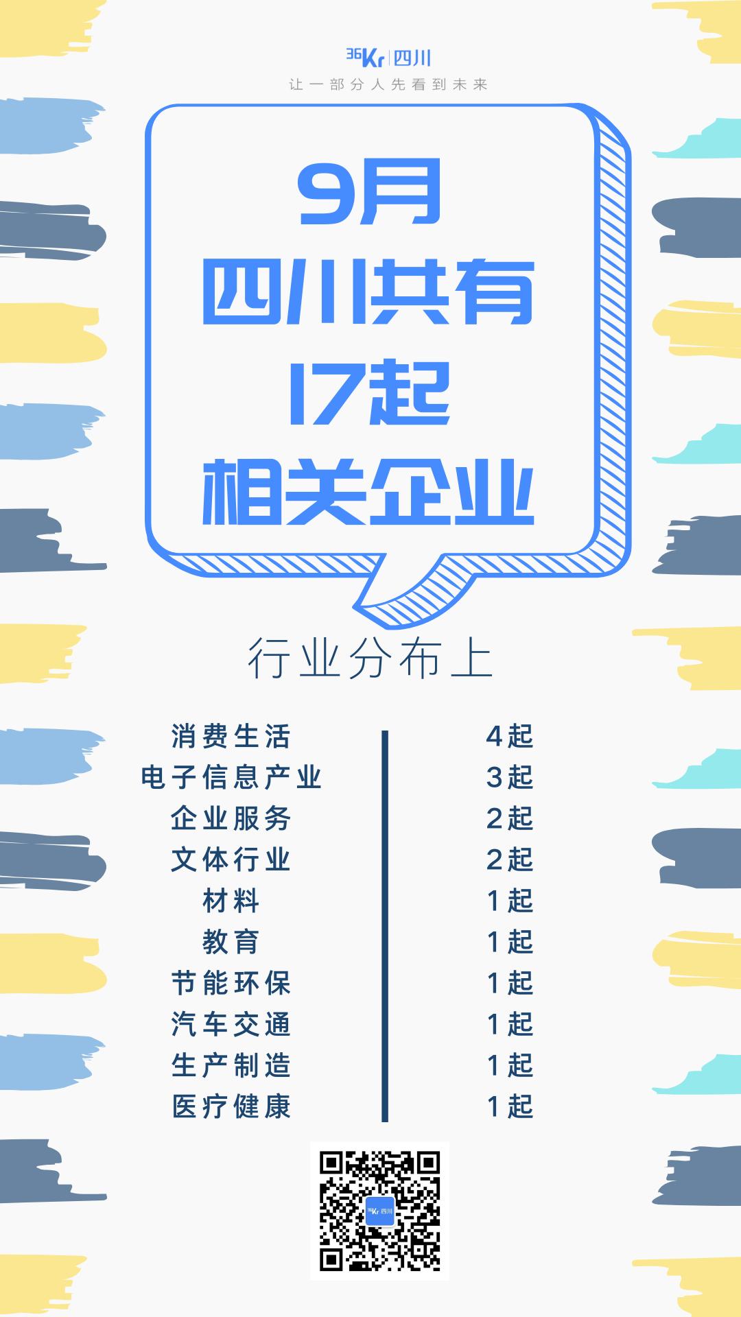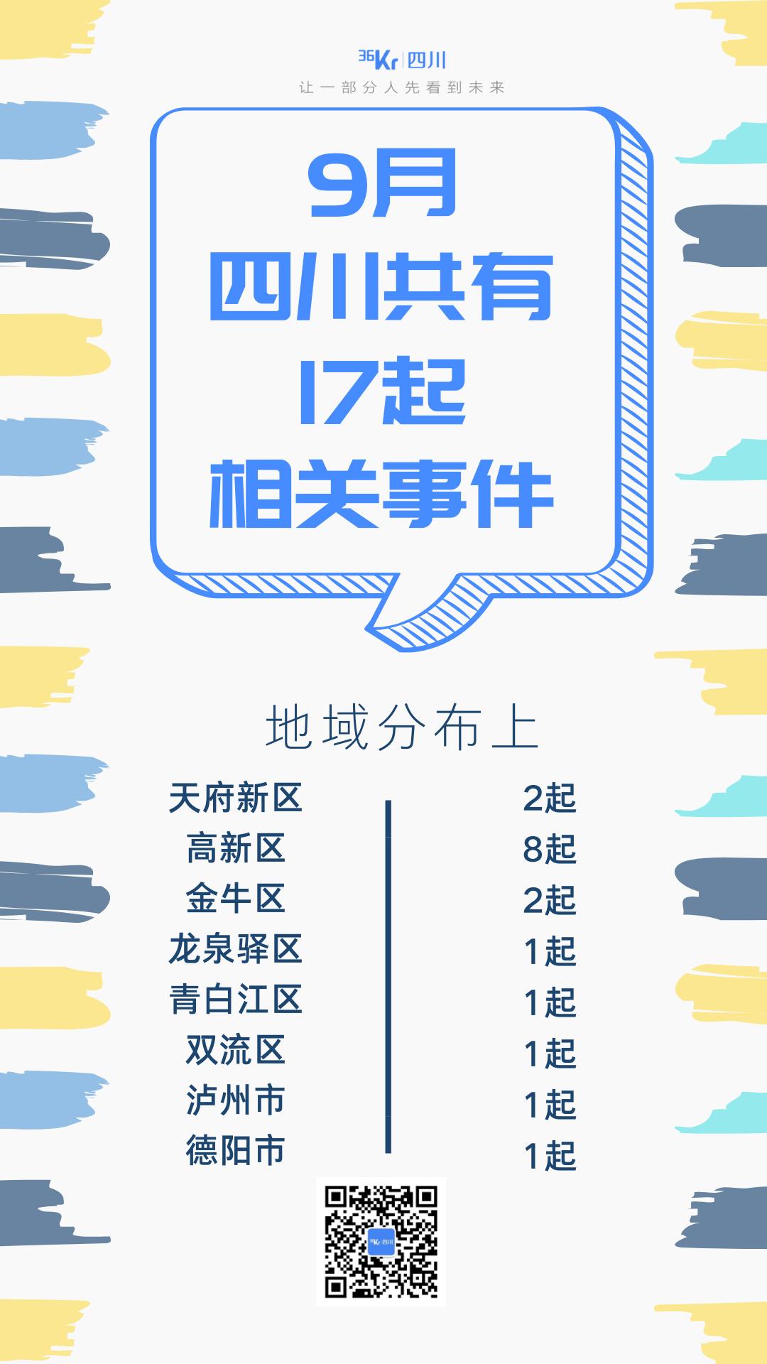 9月,36Kr四川通过公开渠道,共收录与四川相关的融资、上市等事件17起,相关企业17家。其中:获得投融资方面,天使轮6起,Pre-A轮3起,战略投资2起,IPO上市2起,并购4起。