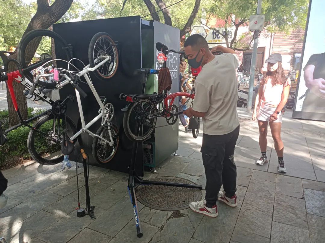 ▲年轻的女性玩家对自己的“小布”自行车进行维修服务。(史凯 拍摄)