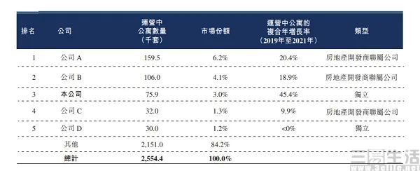 此外在这一招股书中显示,目前集中式长租公寓运营商的前五名中,有三家都有地产开发商的背景。据了解,目前最大的当属万科泊寓、其次是龙湖冠寓,两者市场份额分别为6.2%、4.1%。而根据万科方面披露的2022上半年报显示,泊寓的营收为14.8亿元、同比增长12.3%,出租率为94%、续租率为56%。