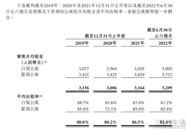 然而伴随着魔方生活扩张速度的加快,同样也出现了“增收不增利”的情况。首先,从直营公寓的单间房月均租金来看,从2019年至2022年,白领公寓的价格大致在2964-3077元之间浮动,价格保持稳定、但出租率却有所降低。截至2022年6月30日的6个月里,魔方生活整体的出租率为82.4%。