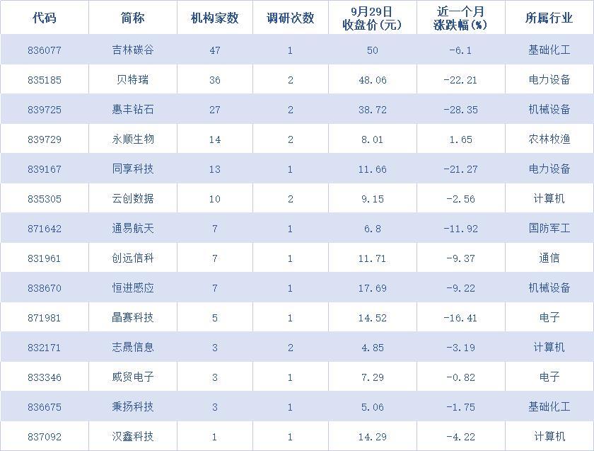 根据犀牛之星研究院截止29日的统计,近一个月(8月30日至9月29日),共有14家北交所公司获机构调研,其中,吉林碳谷最受关注,参与调研机构有47家。