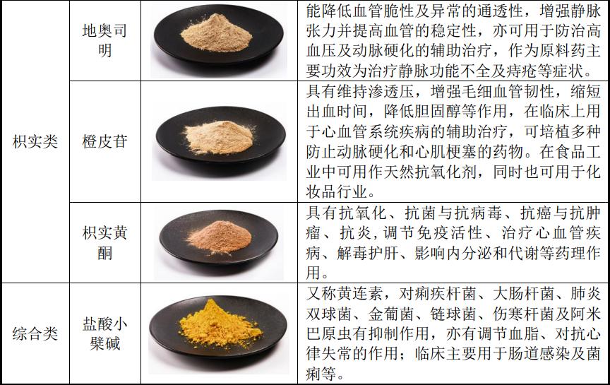 另外,随着心血管疾病、糖尿病等病症的患病率不断上升、消费者健康意识的增 长,以及膳食补充剂等应用领域随着居民健身习惯的推广而不断拓宽,枳实类植物提取物市场空间增幅较快。根据FIOR MAREKETS的相关数据显示,全球枳实类生物黄酮市场预计将从2020年的187.45亿元增长到2028年的360.23亿元,年均复合增长率为8.51%。
