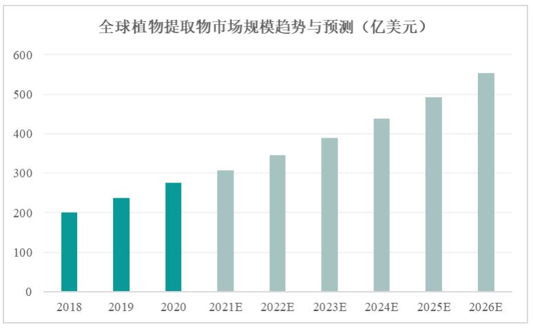 近年来,随着消费者对植物提取物认识的不断提高以及保健品、食品、药品、化妆品对植物提取物需求的增加,全球植物提取物市场稳步增长。根据Markets and Markets数据显示,预计2021年全球植物提取物市场为308亿美元,并将于2026 年达到553亿美元,复合增长率为12.42%。