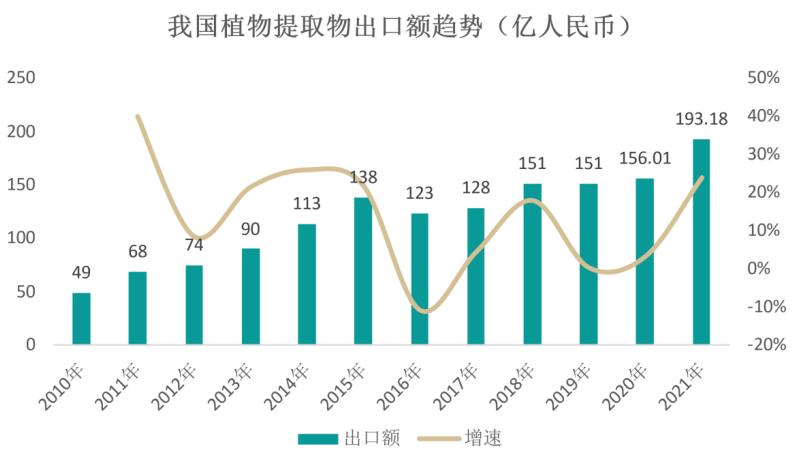 目前,我国主要采用工业提取的植物品种在300种以上,并广泛应用于保健品、食品、药品、化妆品、农药等多个领域。凭借资源优势与多年技术积累,我国现已成为世界上最重要的植物提取物供应地之一,植物提取产品的出口额占行业总收入的80%左右。根据前瞻产业研究院数据显示,2021年我国植物提取物行业出口额达193.18亿元,2010至2021年复合增长率达到13.29%,呈稳定增长趋势。