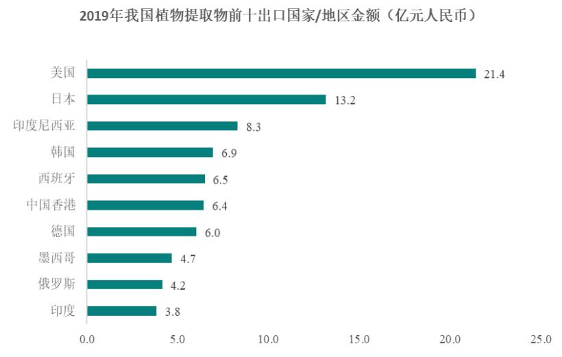 目前,我国的植物提取物产品主要以出口为主。2019年,我国植物提取物出口主要市场集中在北美、欧洲、亚洲三个区域,其中出口金额位列前三的国家分别是:美国、日本和印度尼西亚。