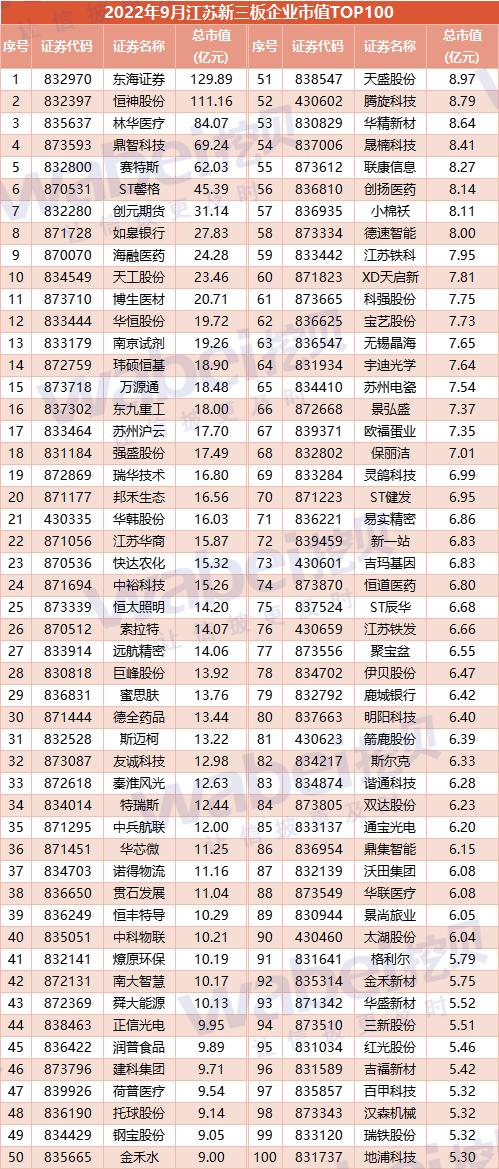 附-2022年9月江苏新三板企业市值TOP100(数据截至2022年9月29日收盘)