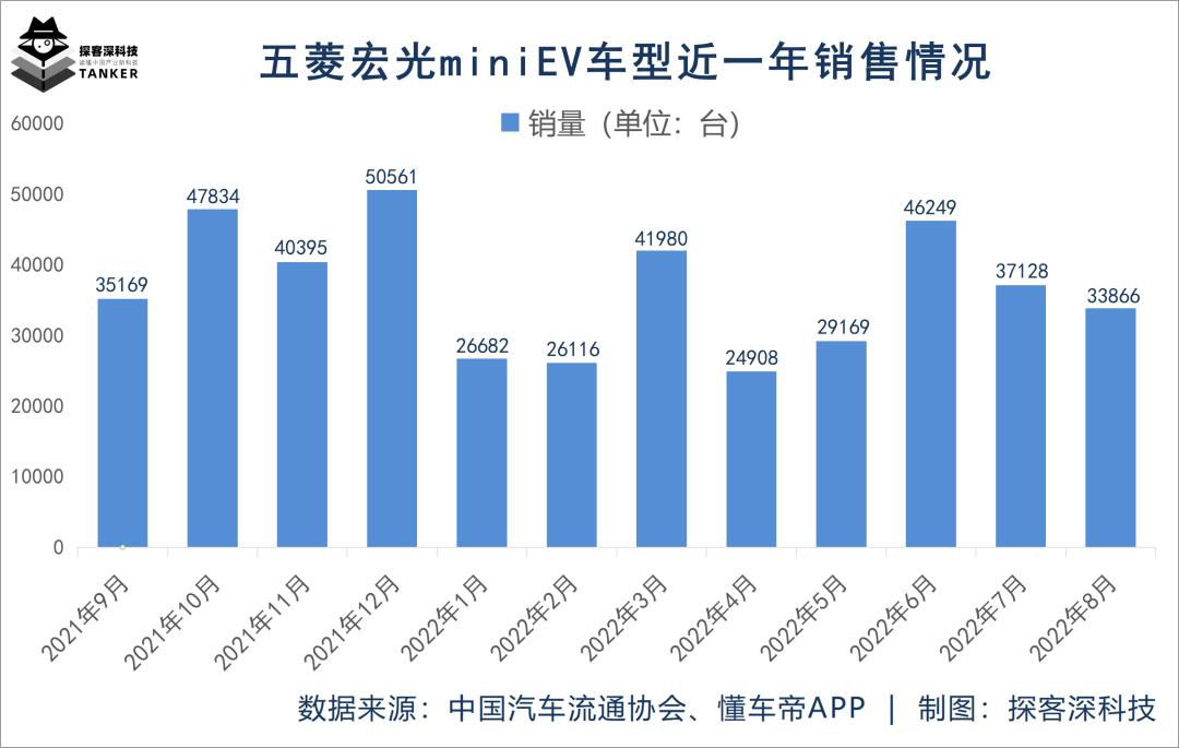 「探客深科技」从懂车帝APP获悉,在2021年9月-2022年8月近一年来,宏光mini车型以44.01万台的累计销量,位居中国汽车销量榜单的第二位,仅次于日产轩逸 (46.38万台) 。同时也是和日产轩逸一起成为近一年销量超40万的车型。
