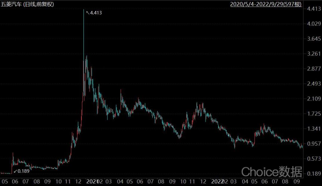 东方财富Choice数据显示:自2020年10月中旬至同年12月底,五菱汽车的股价也从不到0.2元每股拉升至最高4.4元每股,累计涨幅超1200%,相较于宏光mini发布前的2020年6月初的0.2元每股,五菱汽车在2020年下半年的累计涨幅超2100%。
