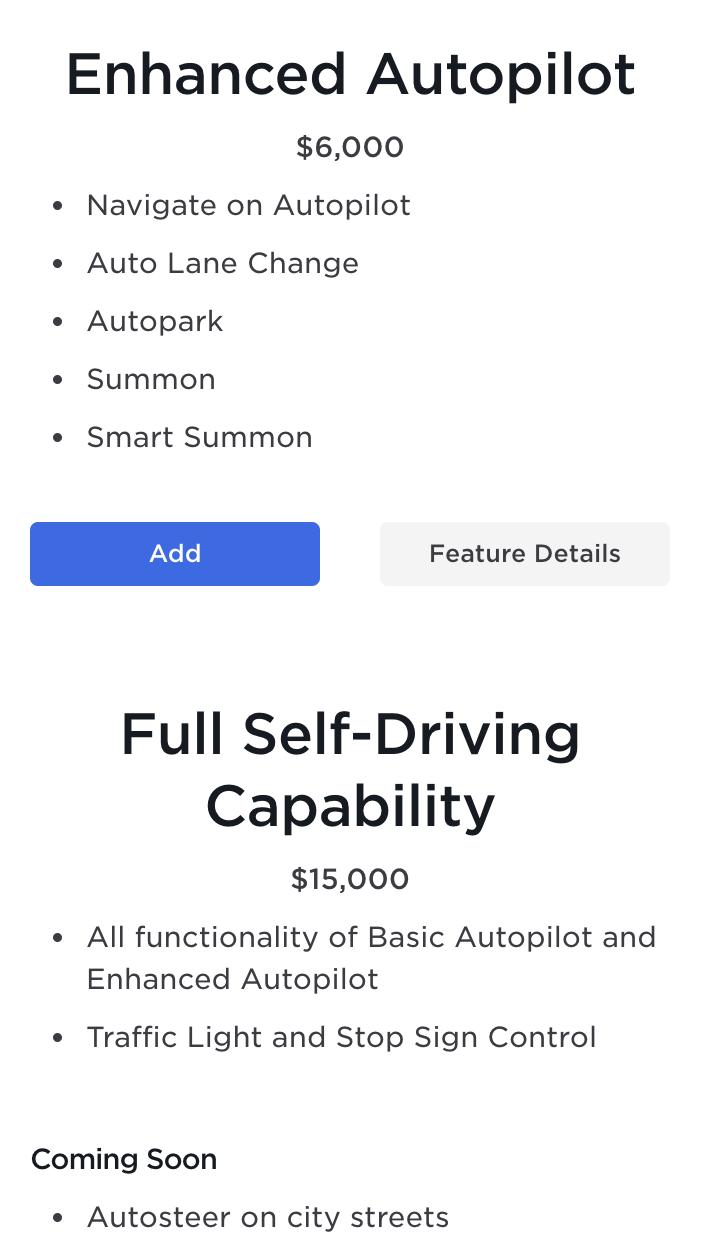另外,可以6000美元选配增强版Autopilot,功能包括:自动导航、车道变更、自动泊车、车辆召唤和智能召唤。1.5万美元的FSD选装包除了增强版Autopilot的功能,还包括信号灯识别和停车标志控制。