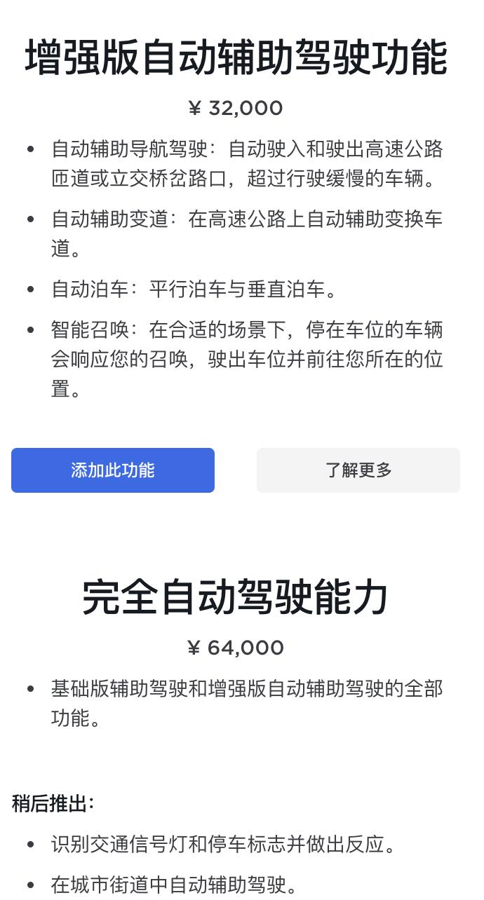 中国的价格分别为32000元与64000元,但国内版的信号灯识别和停车标志控制功能还有待推送。