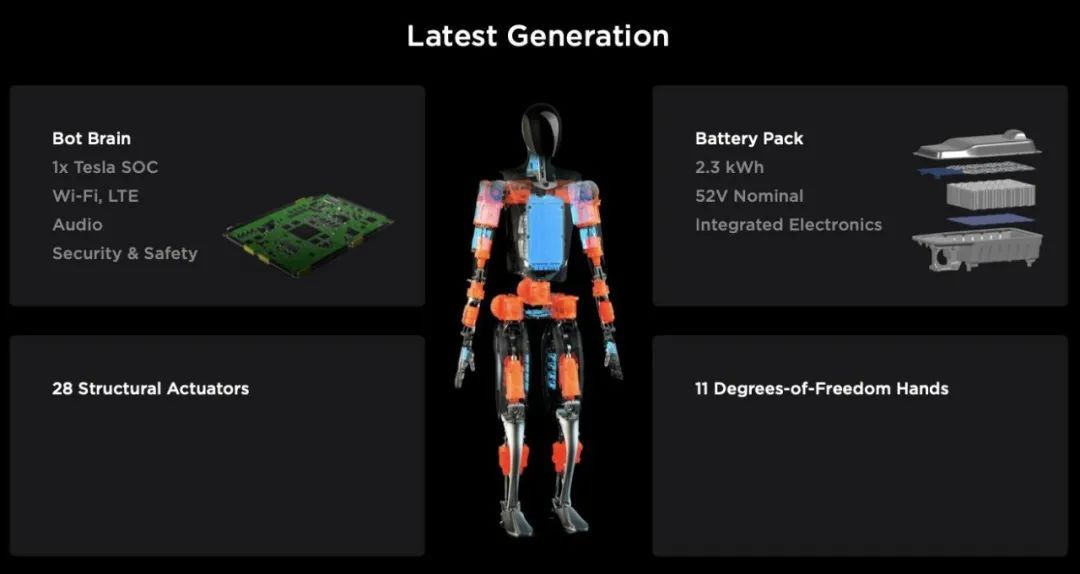 2.3kWh的电池包可供机器人一天的电量,而其大脑则同样使用了特斯拉自研的芯片。