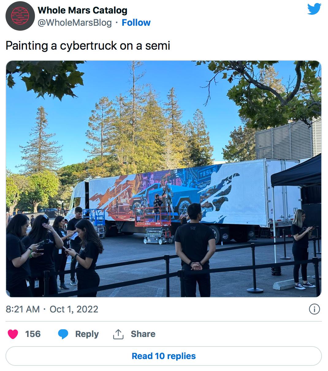 停在 AI DAY举办地点附近的一辆Tesla Semi上的涂鸦展示了Cybertruck的生产场景。